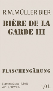 BIÈRE DE LA GARDE III Dieses Bier zeichnet sich durch seine einfache Zutatenliste und einen hohen Alkoholgehalt, an Wein heranreichend, aus. Belgische Mönche brauten wegen eingeschränkter Rohstoffe dieses vom Grundrezept einfache Bier. Bedingt durch den speziellen Brauprozess ergibt sich eine eigene Geschmacksrichtung. Getrunken wird dieses Bier glasweise als Spezialität oder zu schweren Speisen. Auch dieses Bier zeichnet sich durch das R.M.MÜLLER BIER-Brauverfahren mit Haupt- und Flaschengärung aus. Bedingt durch den hohen Alkoholgehalt ist hier eine längere Lagerung sogar empfehlenswert, da das Bier dadurch noch eine spezielle Reifung erreicht. |